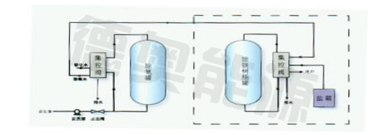 供熱水鍋爐或水質(zhì)要求相同的用戶時,軟化水經(jīng)由集控閥進入除氧器上部,經(jīng)海綿鐵過濾除氧后,由除氧器下部流出,再經(jīng)集控閥流向鍋爐或除氧水箱。反洗時,若水壓不足時,控制器發(fā)出信號,反洗泵啟動,反洗水由除氧器下部流入,將海綿鐵中的沉淀物帶起經(jīng)集控閥排污口排出。