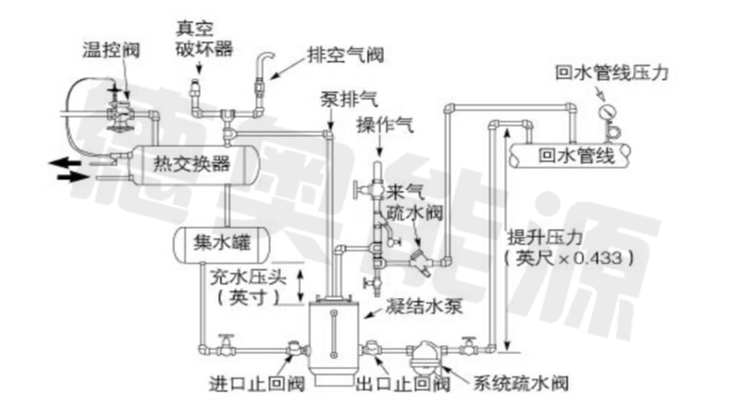 3.氣動凝結(jié)水回收裝置有開/閉兩種型式,每種型式根據(jù)回收區(qū)域用各熱設(shè)備工況及用熱系統(tǒng)具體情況進行進行針對性配置;