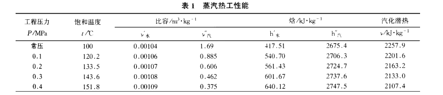 抽汽噴射器的節(jié)能效益,集中體現(xiàn)在增加回收了一部分原來可能要排放的乏汽的熱量。應(yīng)該承認(rèn),噴射器本身就是一種效率比較低的流體設(shè)備,再加上水和水蒸氣在比容方面的巨大差別,使得噴射器的抽汽能力突出到工作流體抽吸乏汽并盡可能地促使凝結(jié)的過程上面。蒸汽熱工性能見表1。