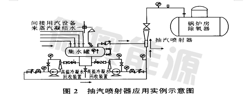 在實際使用中,抽汽噴射器根據(jù)不同的需要和工藝流程,具有幾種應(yīng)用模式。圖2顯示了一個典型的應(yīng)用工藝流程。